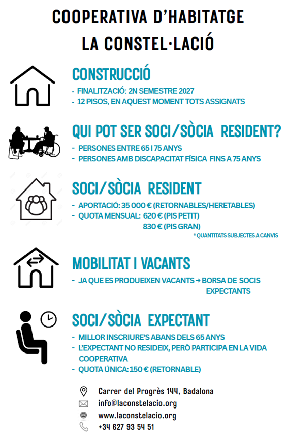 La Constel·lació és una organització de persones en forma de cooperativa, que es beneficiarà d’espais i serveis comuns i això farà que el cost econòmic per l’ús sigui inferior al que es paga correntment en el mercat de l’habitatge privat.